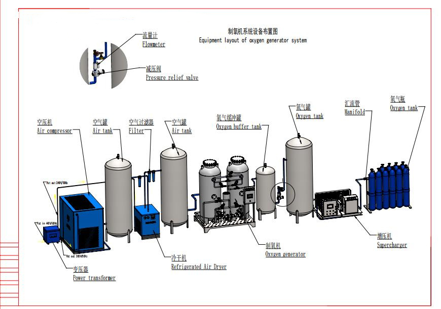 根據(jù)變壓吸附原理,采用沸石分子篩為吸附劑,由于沸石分子篩有選擇性的吸附特性,氮被分子篩大量吸附,氧在氣相中被富集,在變壓吸附的作用下實(shí)現(xiàn)氨氧分離。采用雙塔或多塔結(jié)構(gòu),一邊吸附氧,一邊解吸再生,通過(guò)PLC等智能程序控制氣動(dòng)閥門的啟閉,使兩塔或多塔循環(huán)交替,連續(xù)產(chǎn)出高品質(zhì)氧氣。