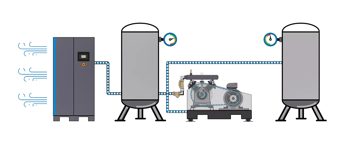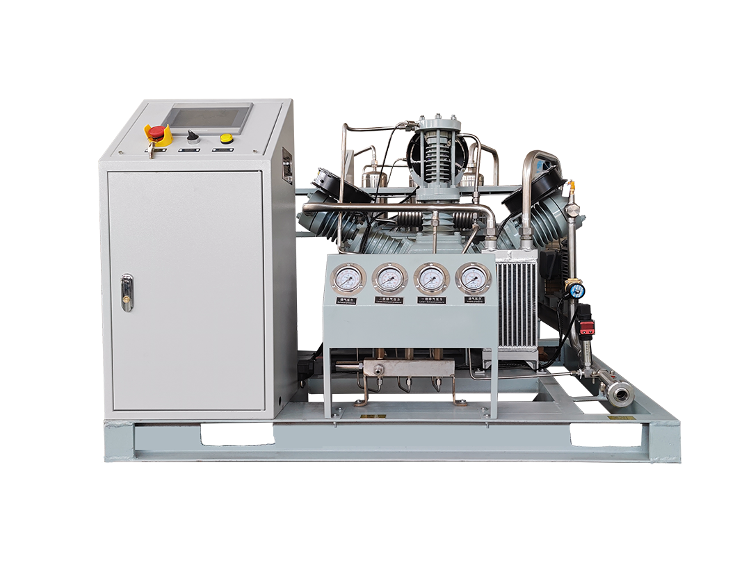 無油增壓壓縮機由主機、電動機、儀表和電氣控制部件組成。活塞增壓器工作時,首先電動機通過三角皮帶傳動驅動曲軸產生旋轉運動;然后活塞通過連桿往復運動以改變氣缸容積;最后,氣缸內的氣體壓力增加,氣體通過排氣閥,單向閥和管道注入儲罐以供使用。