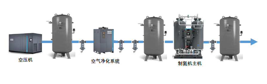 根據變壓吸附為原理,采用高品質碳分子篩為吸附劑,在一定的壓力下,由于動力學效應,氧、氮在碳分子篩上的擴散速率差異較大,利用氧分子被碳分子大量吸附,氮分子在氣相富集,達到氧氮分離。由于碳分子篩對氧的吸附容量隨壓力的不同而明顯差異,降低壓力,即可解吸碳分子篩吸附的氧分子,使碳分子篩再生,得以重復循環使用。采用兩個吸附塔流程,一塔吸附產氮,一塔解吸再生,循環交替,連續產出高品質氮氣。